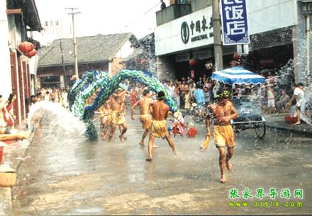 張家界潑水龍又叫“澆水龍”,于唐朝時期由移居本地的白族興起演變而成,在永定區(qū)的尹家溪鎮(zhèn)西尹村、莫家崗村十分盛行,是當?shù)?a class="insidelink" href="http://www.pinpaicheng.cn/fengqing/1130174734.html" target="_blank" title="土家族">土家族,白族、苗族在天熱干旱時節(jié)求雨祈福的一種形式。一旦出現(xiàn)旱災,當?shù)仡^面人物就會出來組織潑水龍,演出極其隆重。