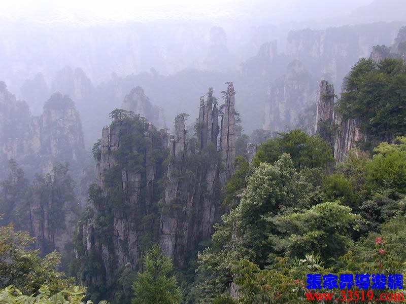 (大觀臺)這就是大觀臺。極目遠(yuǎn)眺,千百座奇峰盡收眼底。一位詩人說,武陵源的砂巖峰林是一步一觀景,千步千造型,一山有四季,十步不同天。專家測算出武陵源石峰有3103座。一如一位高超的雕塑大師,模擬宇宙萬物,無不形狀逼真,維妙維肖,栩栩如生,呼之欲動。有的如海螺出水,有的如金龜銜日,有的如蓮花盛開,有的如天橋橫空,有的如長槍刺天,有的如寶塔聳立,有的如老人采藥,有的如玉女梳妝,有的如將軍出征,有的如戰(zhàn)馬長嘯,有的如情人幽會,有的如夫妻相擁,有的如仙女散花,有的如村姑守望.....有的孤峰獨秀,有的直插云霄,有的婷婷玉立,有的威武勇猛,有的小巧玲瓏,有的大氣磅礴。進(jìn)入武陵源,但見一片峰的森林,峰的世界,峰的海洋。挺拔、奇秀、集中、原始、粗獷、古野。這就是武陵源。一位藝術(shù)大師說:武陵源的山峰,改寫了山的概念。大攝影家陳勃說:“三山五岳堪比美,華夏風(fēng)光每一流。”王繼杰先生說:“武陵源上三日游,勝讀千篇李杜詩。”許世杰先生說:“秀幽險峻稱奇絕,五岳黃山拜下風(fēng)。”李成瑞先生為此大抱不平:“神州勝景誰為最?須請霞公重評勘。”可惜徐霞客無緣到大觀臺來,也不可能為武陵源作甚評價了。