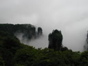 這里,我還給大家講個奇異現(xiàn)象。1991年4月的一天下午,雨過天晴,整個天子山漫開一片朦朦朧朧的薄霧,從西海到神堂灣一帶,一座座巖峰在霧中時隱時現(xiàn)。一群上海游客來到點將臺,忽然,一幅奇異的場景把大家驚呆了:神堂灣中央,七位少女從云霧中飄落到一座巖峰峰頂?shù)钠脚_上,飲茶、撫琴,翩翩起舞達(dá)40分鐘之久。游客們起初以為是一種幻覺,揉揉眼睛再看,仍然是三綠四紅,長發(fā)披肩,體態(tài)婀娜,舞步輕盈。直到“仙女們”隨一片云霧漸漸隱去的前一秒鐘,大家仍然不敢弄出半點聲響,有相機的就拼命按快門。遺憾的是距離太遠(yuǎn)了,當(dāng)晚將膠卷取去沖洗,什么也沒留下。消息傳開后,有人相信,有人不相信。其實,神話也好,事實也好。這種奇異現(xiàn)象完全可用科學(xué)去解釋。“海市蜃樓”這是人所共知的;而大沙漠中不也經(jīng)常出現(xiàn)綠洲、村莊、城市么?
